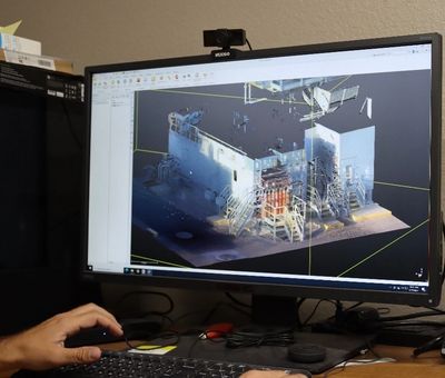 Laser scanning is the controlled deflection of laser beams, visible or invisible. Scanned laser beams are used in some 3-D printers, in rapid prototyping, in machines for material processing applications specific to mapping. PNL utilizes LASER beams in several ways. The most basic test is for making linear measurements. LASER beams have great accuracy over a long range, as accurate as 0.001” over a 12’ length. Another application is for making computed radiographs using phosphor image plates. A LASER scans the phosphor plate after being exposed to radiation causing variation in phosphor emittance which can then be captured to produce a radiograph. A third way we use LASER beams is for mapping structures using a three-dimensional beam. This is accomplished using a 3D Laser Scanner mounted on a transom. The scans can be processed to create images and drawings.